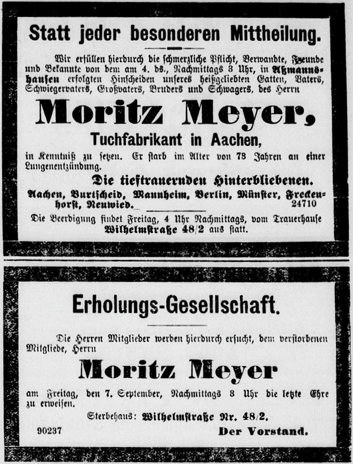 Während Elias und seine Frau Friederike 1878 mit ihren beiden Kindern nach Berlin zogen, wo sie bis zu ihrem Tod Ende der 1890er Jahre wohnten, führten Moritz und seine Frau Sibilla, geborene Salomon die Kleiderhandlung Gebrüder Meyer und die Tuchfabrik Meyer et Comp. in Aachen weiter. Zunächst wohnte die Familie am Seilgraben, später in der Hochstraße, der heutige obere Teil der Theaterstraße. Das Paar bekam acht Kinder; die ersten beiden starben im Säuglingsalter, als späterer Nachfolger seines Vaters wurde 1845 Sali Eduard geboren, nach ihm noch fünf Töchter.