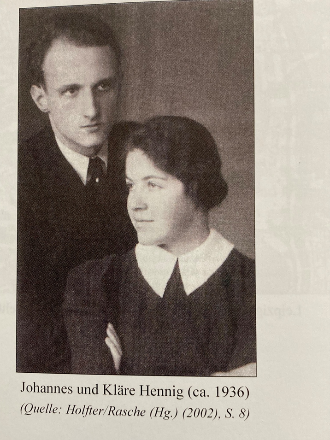 Als Hans Hennig im Februar 1933 die letzten Abschnitte seiner Dissertation in Philosophie verfasste, sah er in der Zeitung das Foto eines Mannes, der der „Rassenschande“ mit einer Jüdin bezichtigt und angeprangert wurde - ich verzichte auf die zeitgenössisch menschenunwürdige genaue Formulierung. Da wurde Hans klar, dass er seine Braut sehr schnell heiraten musste. Nach der Ernennung Hitlers zum Reichskanzler am 30. Januar und dem Ermächtigungsgesetz am 24. März würde von Glaubens- und Gewissensfreiheit sowie Gleichheit aller Deutschen vor dem Gesetz keine Rede mehr sein. Mitten in Hans‘ Prüfungen zum Staatsexamen in Germanistik heirateten Kläre und er in Aachen am 11. April.