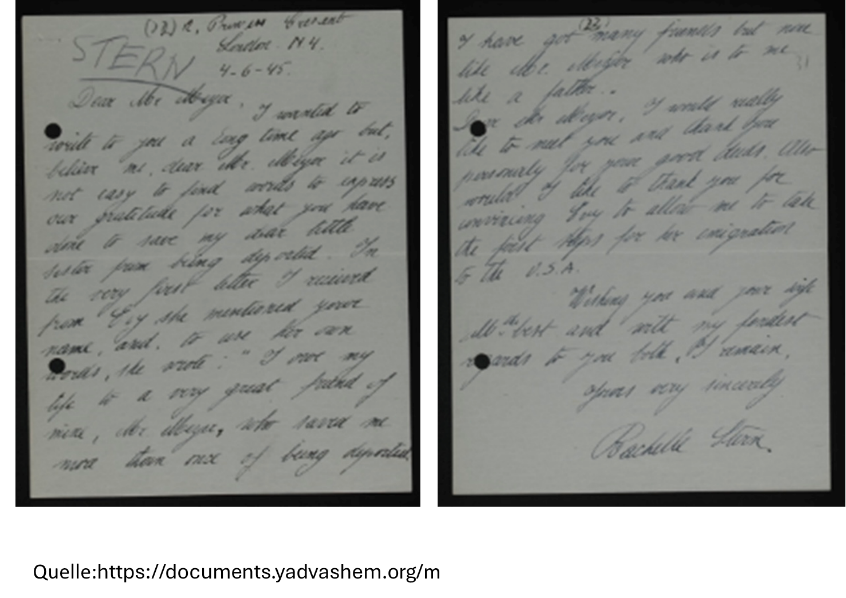Ein weiteres Dokument ist der Dankesbrief von Rachelle Stern, sie schreibt am 4.6.45 aus London: