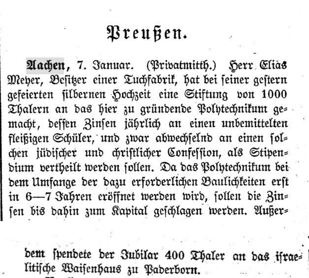 Die Brüder Elias und Moses Moritz Meyer, 1811 bzw. 1815 geboren, stammten aus Freckenhorst bei Münster in Westfalen. Sie werden im Jahr 1843 als Gebrüder Meyer in Aachen erwähnt. Ihr Geschäft wuchs zu einer der erfolgreichen jüdischen Tuchhandlungen. Dass Elias nicht unbedeutend für Aachen war, erkennt man etwa an der Gründung der Stiftungen, die er und seine Frau Friederike anlässlich ihrer Silberhochzeit und ihres Wegzugs aus Aachen gründeten.